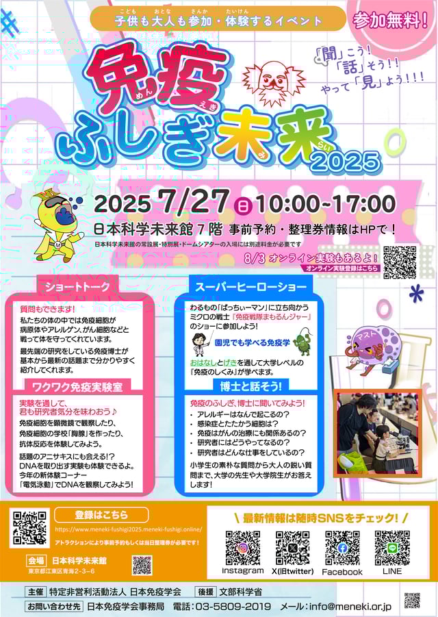 今年は、「聞」こう!「話」そう!!やって「見」よう!!! をキャッチフレーズに、2025年7月27日(日)は東京お台場・日本科学未来館にて、8月3日(日)はオンラインにて、二日間にわたり 「免疫ふしぎ未来2025」 を開催いたします。